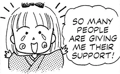 The Dream Team: "Before, when Sana and her friends were still in elementary school, I drew everything by myself. But now it's too much for me to handle! Junior high is so complicated! So now I have assistants who draw the school backgrounds for me. It really helps because they're better than me at it! And my sister still helps she used to just put down plain graytones, but now she can do the fancy shading stuff, too!"
